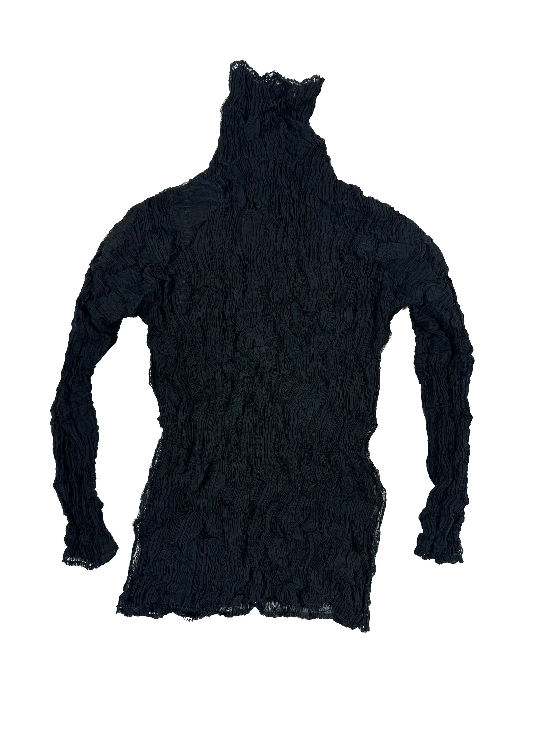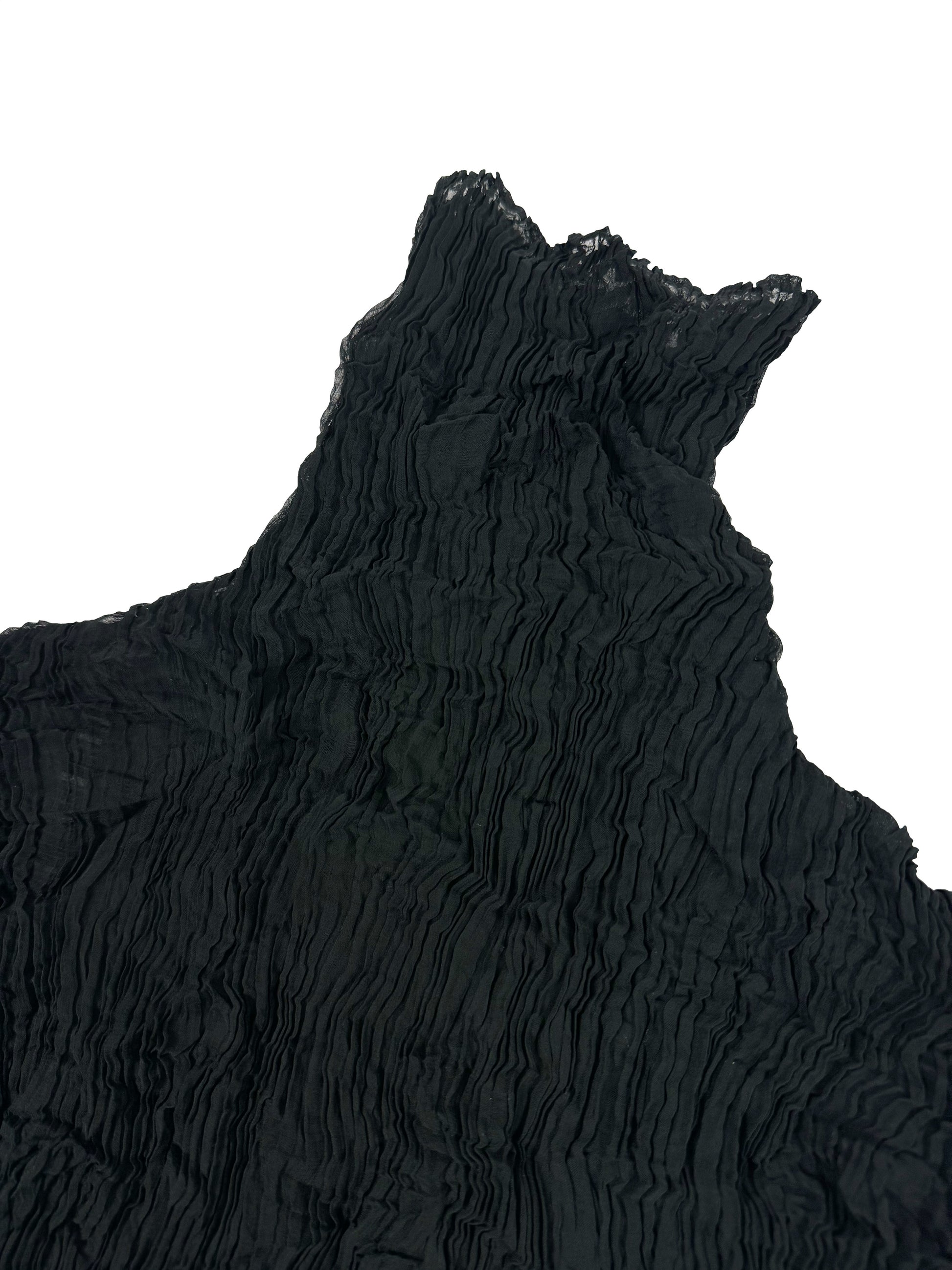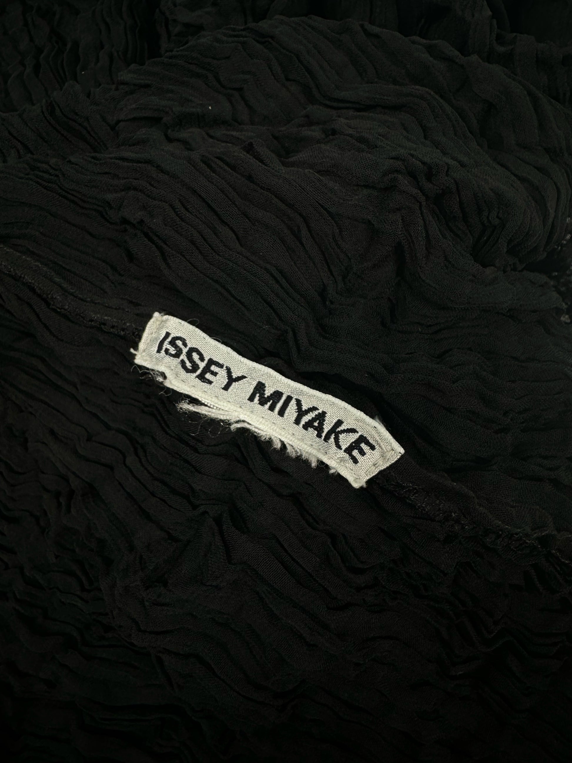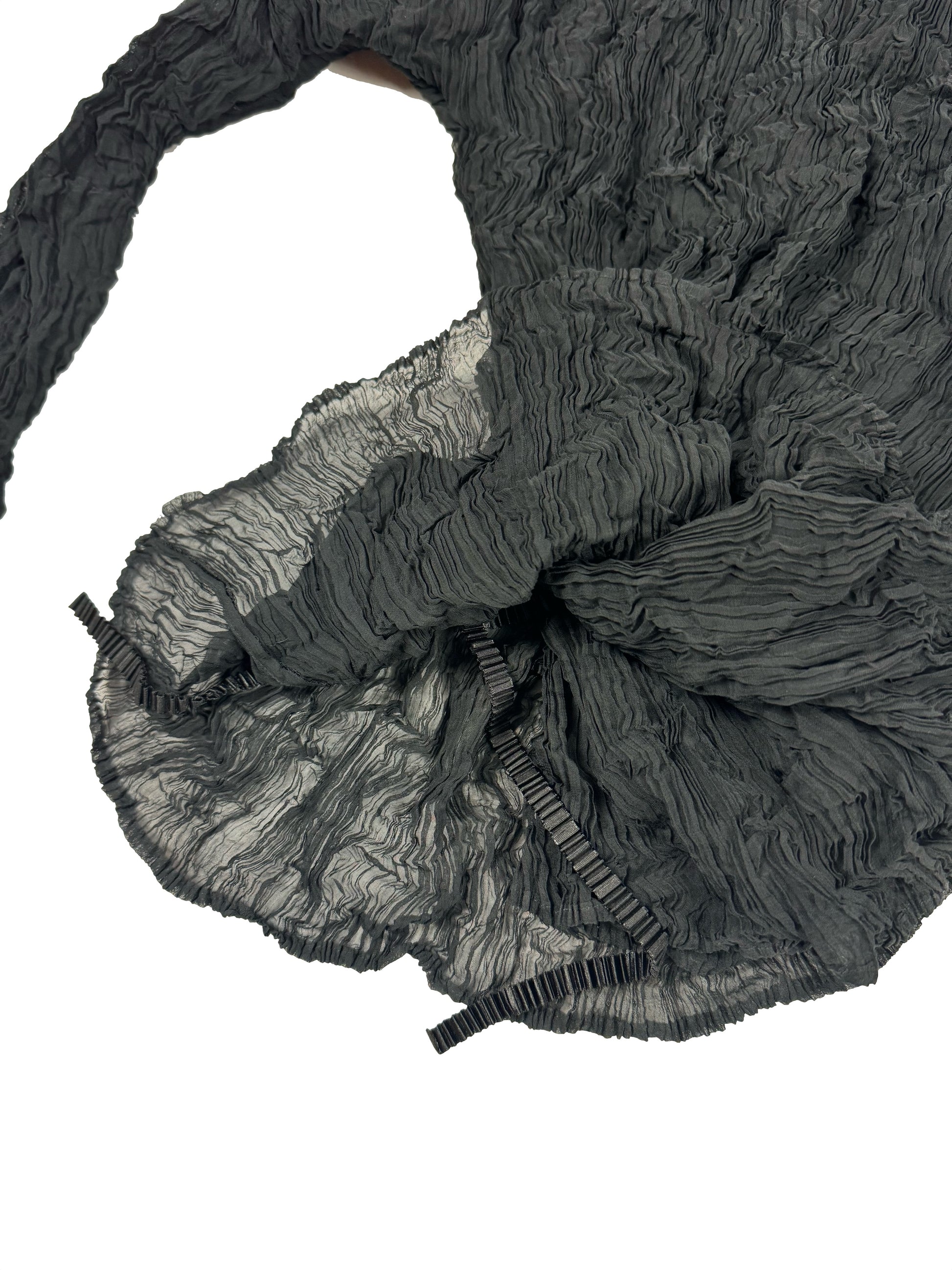 This expertly crafted black top by Issey Miyake features signature pleating that adds depth and movement. Its double-layered construction combines ruffled textures with multiple stripes of pleated fabric, creating a dynamic and sophisticated silhouette. Perfect for those who appreciate innovative design and timeless elegance in their wardrobe.