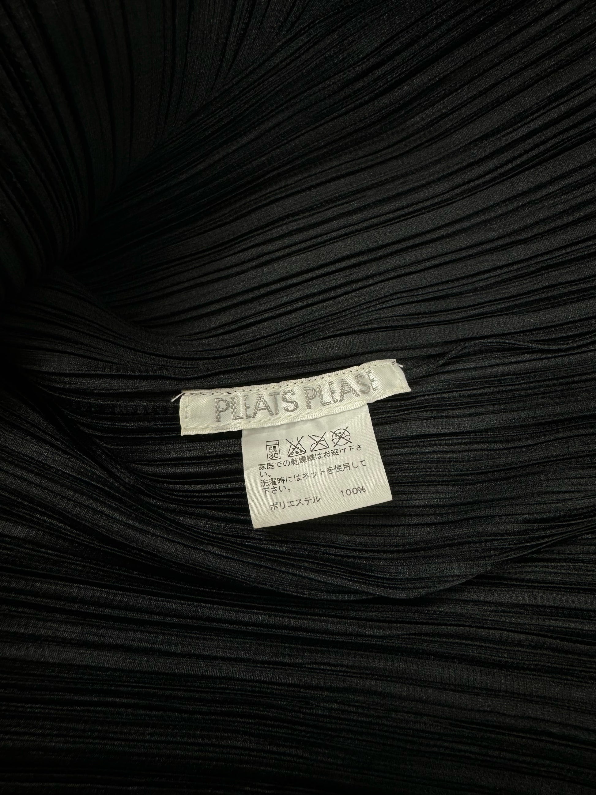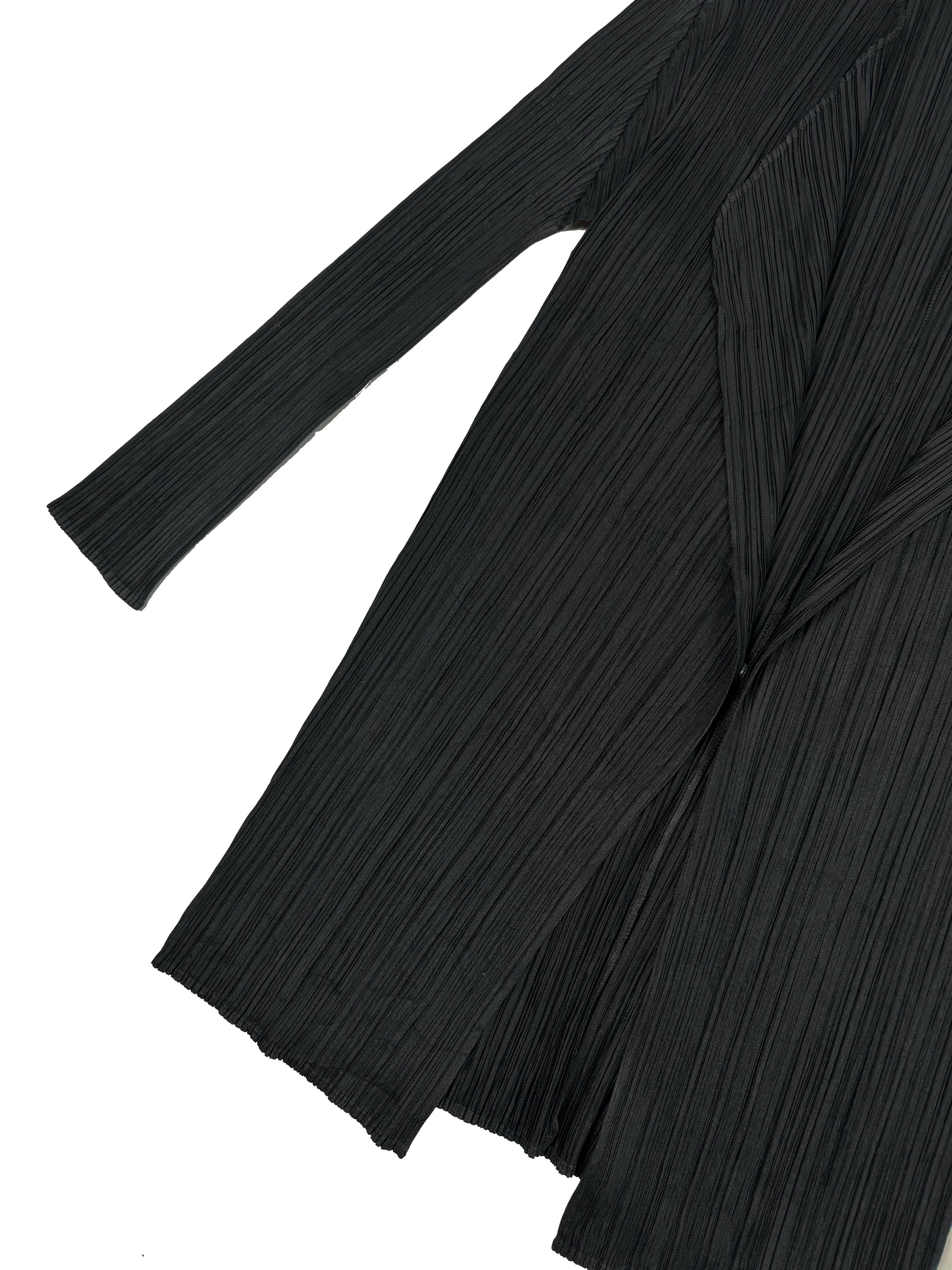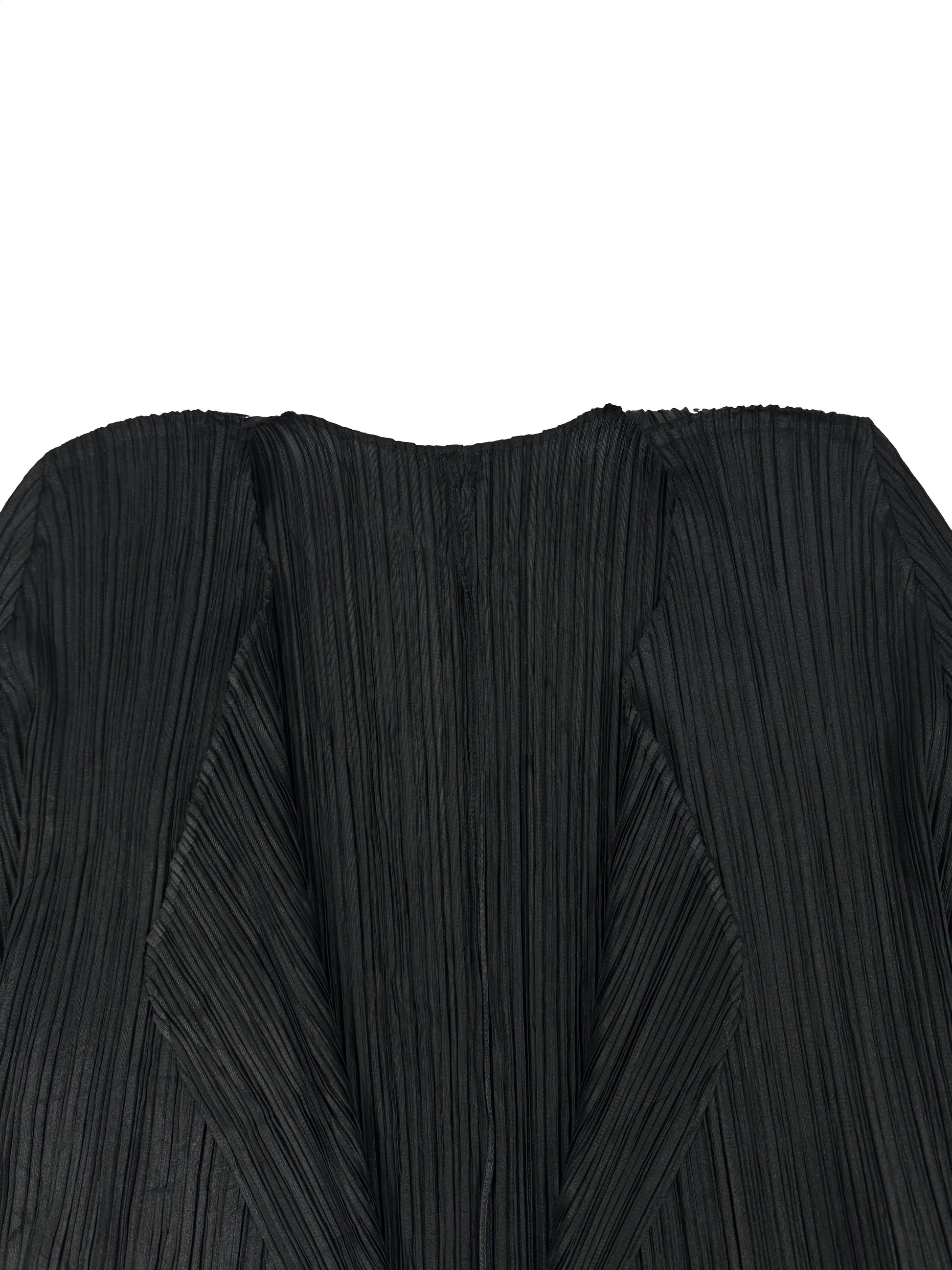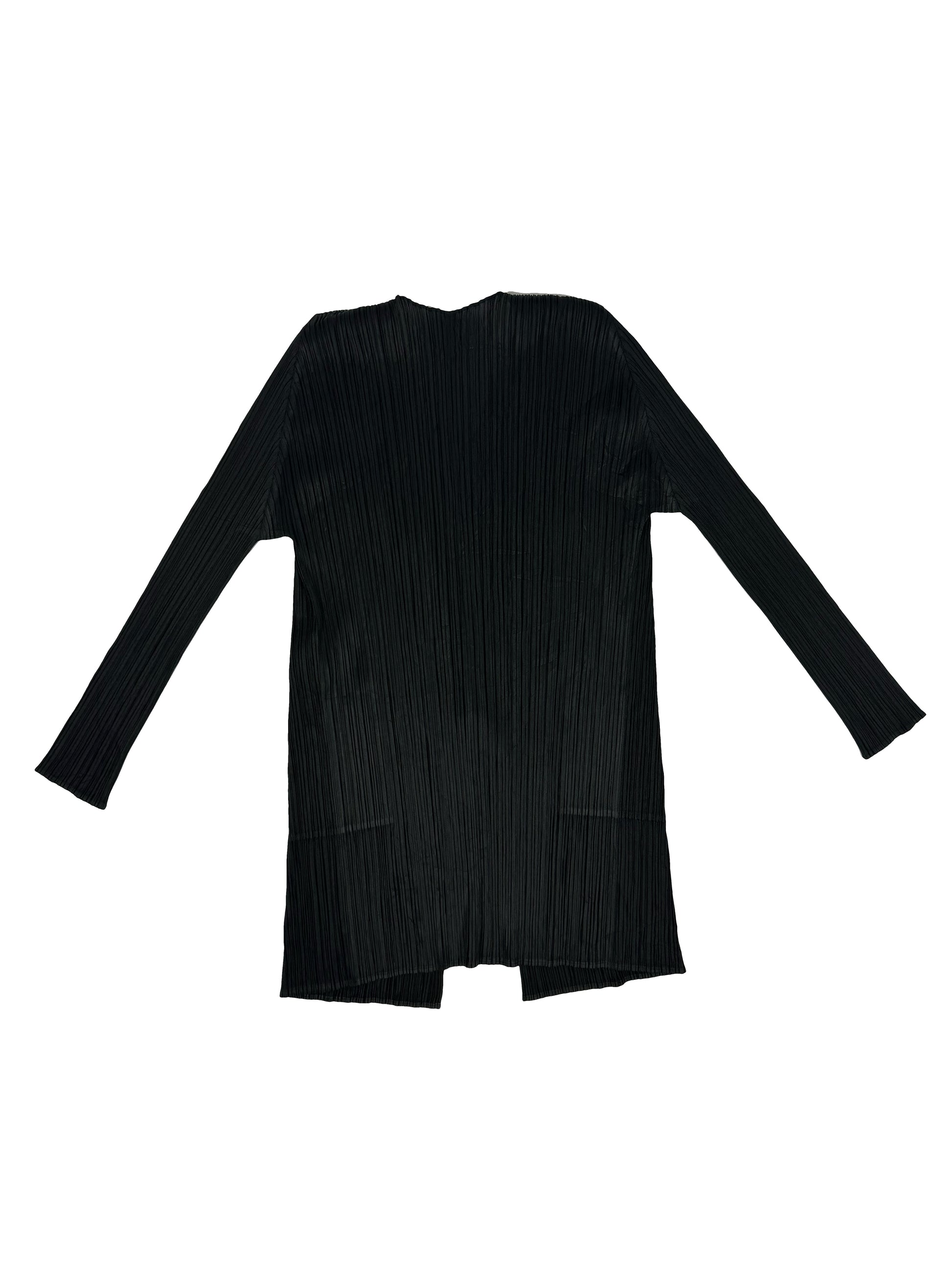This black pleated cardigan by Issey Miyake showcases innovative textile design with finely crafted pleats that deliver texture and movement. Featuring a convenient button snap closure, it offers ease of wear while maintaining a sleek, contemporary silhouette. Perfect for layering, this piece combines functionality with avant-garde aesthetics, ideal for those who appreciate refined, architectural fashion.