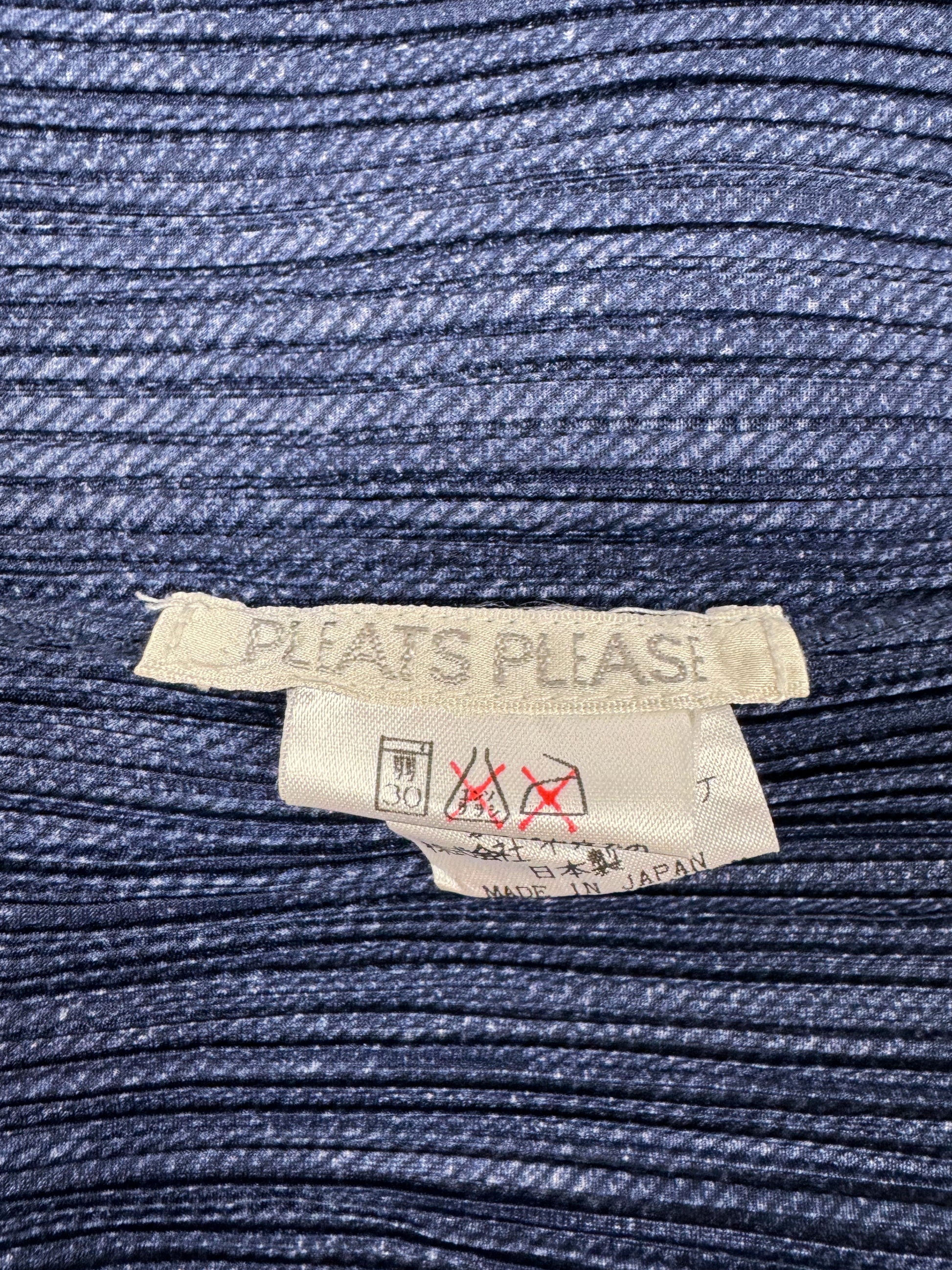 This pleated cardigan by Issey Miyake combines innovative design with classic appeal. Featuring six buttons and a distinctive denim print, it offers the visual texture and style of a denim jacket with the softness and flexibility of pleated fabric. Ideal for layering, this piece delivers both comfort and a sophisticated, fashion-forward look.
