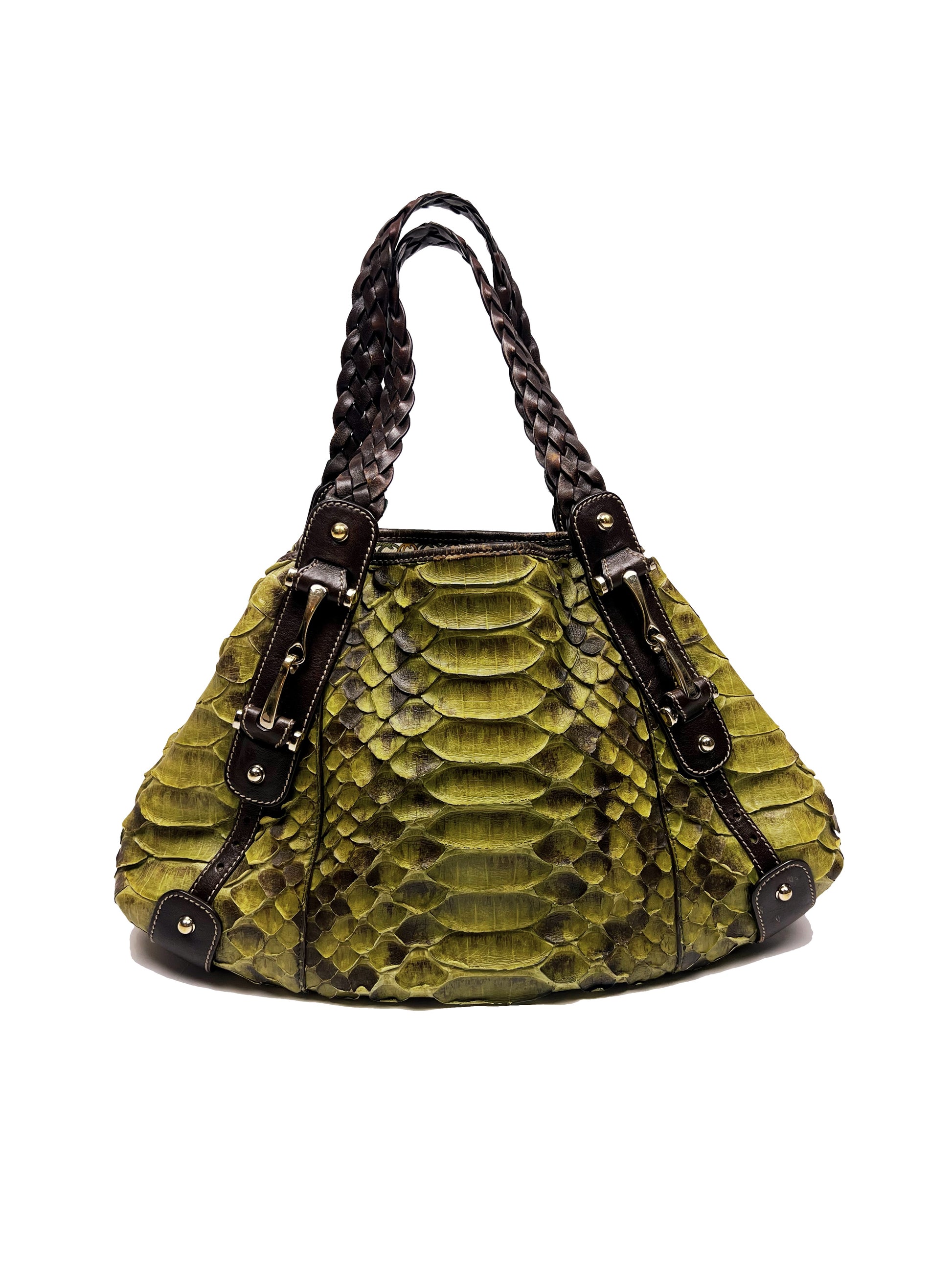 The 2006 Pelham Python Bag by Gucci showcases exquisite craftsmanship with its genuine green python leather. This luxury accessory combines timeless elegance with a distinctive texture, offering both durability and a standout aesthetic. Perfect for collectors and connoisseurs, it embodies Gucci’s refined style and heritage from the mid-2000s, making it a unique addition to any sophisticated wardrobe.