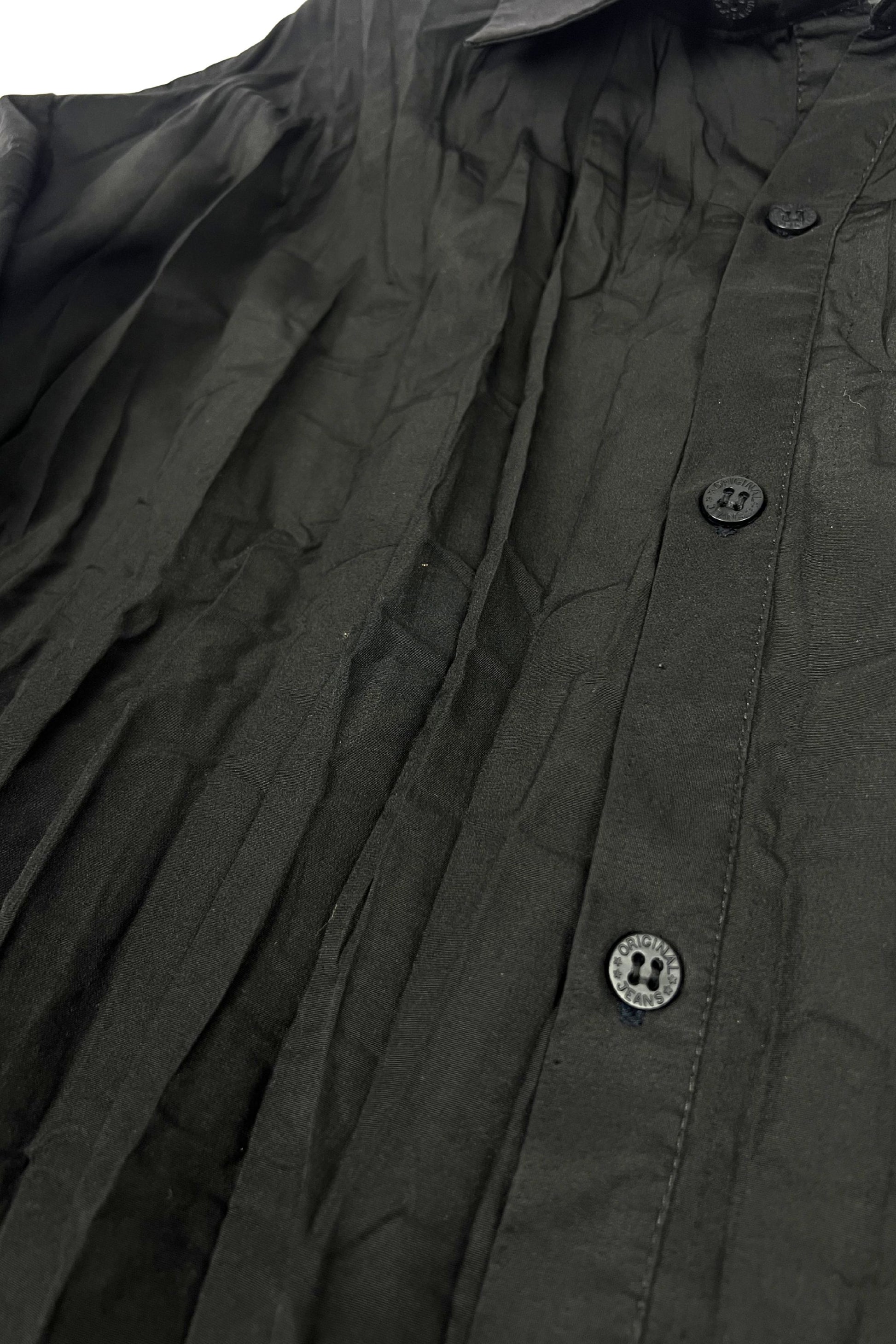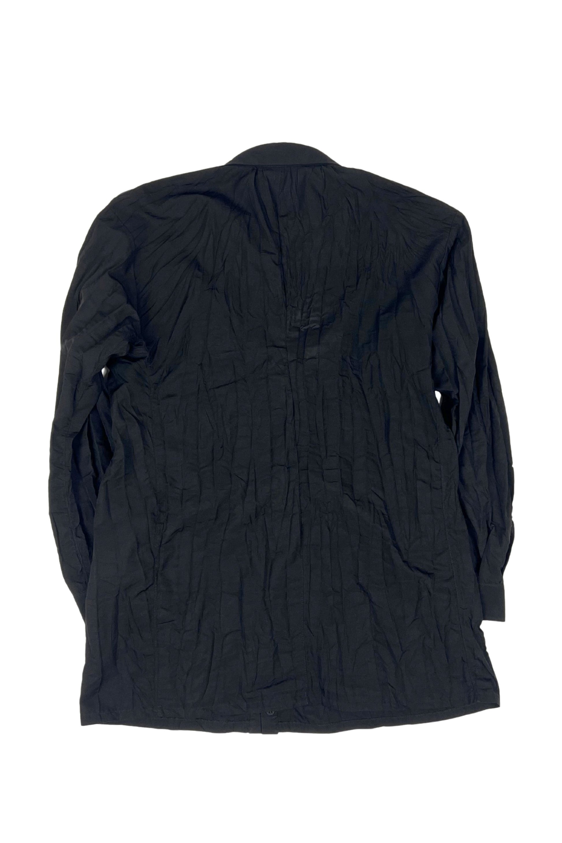 A rare archival piece from Issey Miyake Men, this black shirt showcases the designer’s signature pleating technique. Unlike the uniform micro-pleats of Pleats Please, this shirt features irregular vertical pleats, giving it a structured yet organic texture that moves with the body. Cut with a relaxed silhouette, button closure, and classic collar, it blends tailoring with avant-garde fabric innovation.