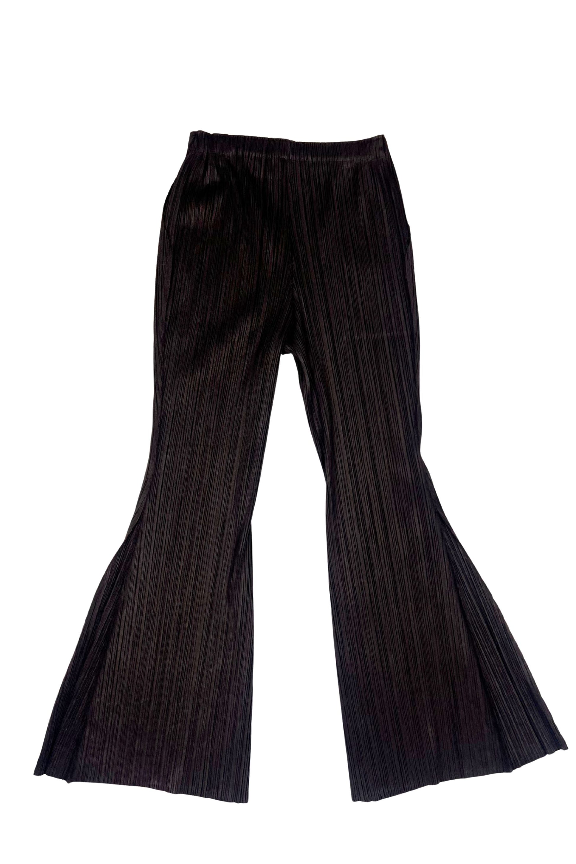 Rare 90s Pleats Please flared pants in a deep brown, crafted from Miyake’s signature permanently pleated fabric. Lightweight, wrinkle-proof, and designed to move, these are a collectible cut that’s less common than straight-leg styles. Pair with a fitted top and platforms for a retro silhouette, or layer with a cropped blazer for a sharp contrast.