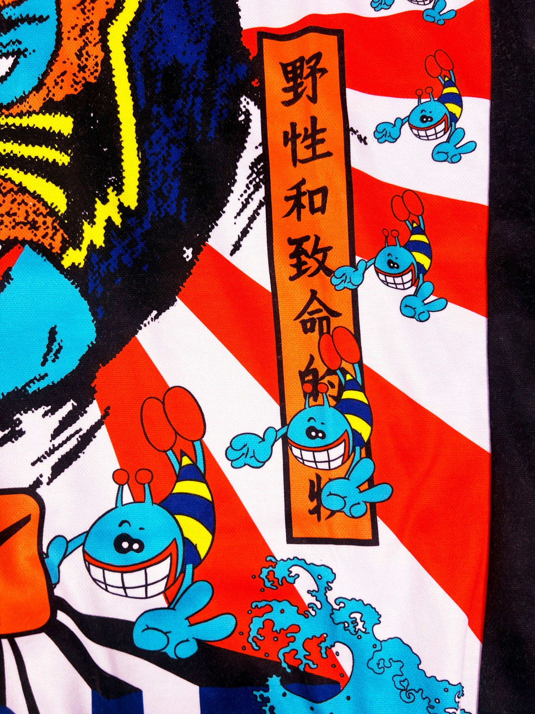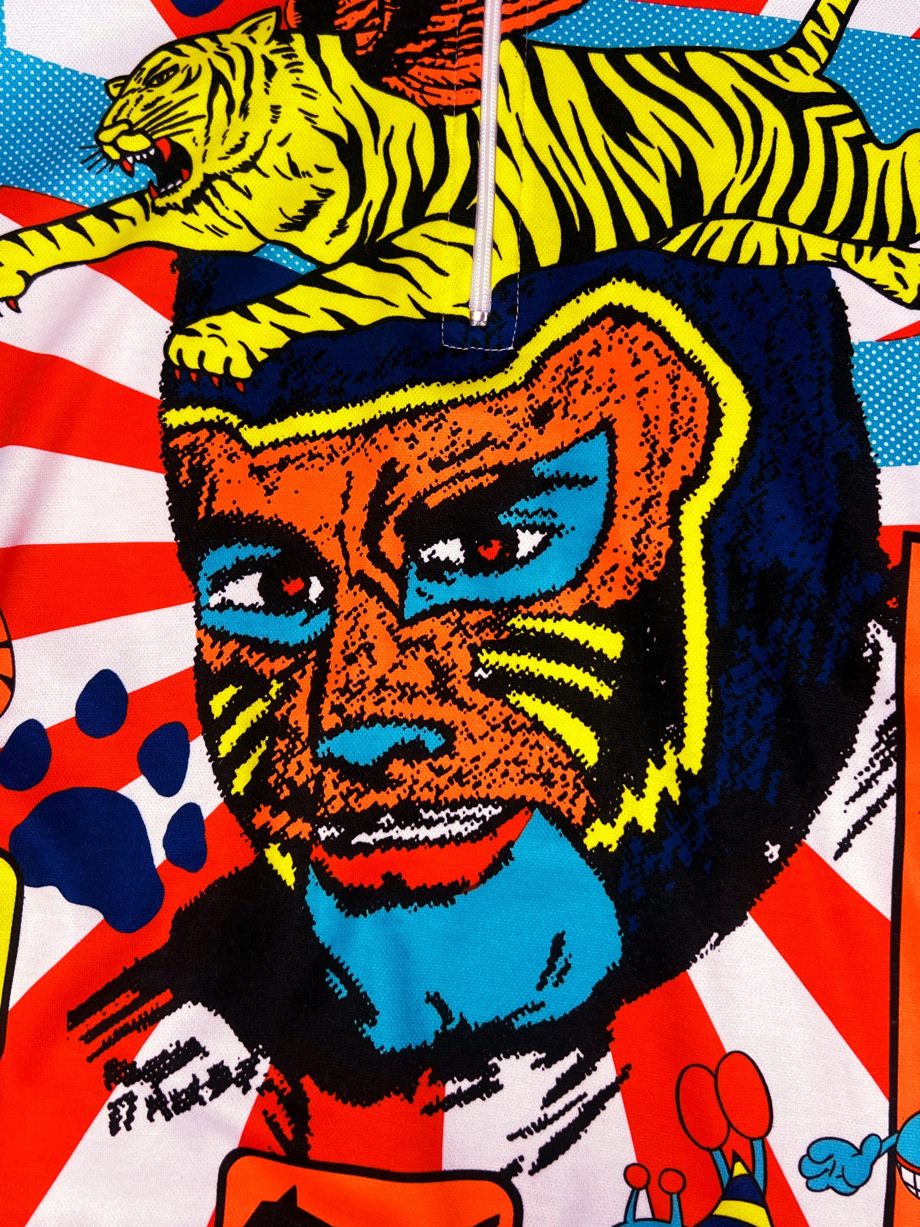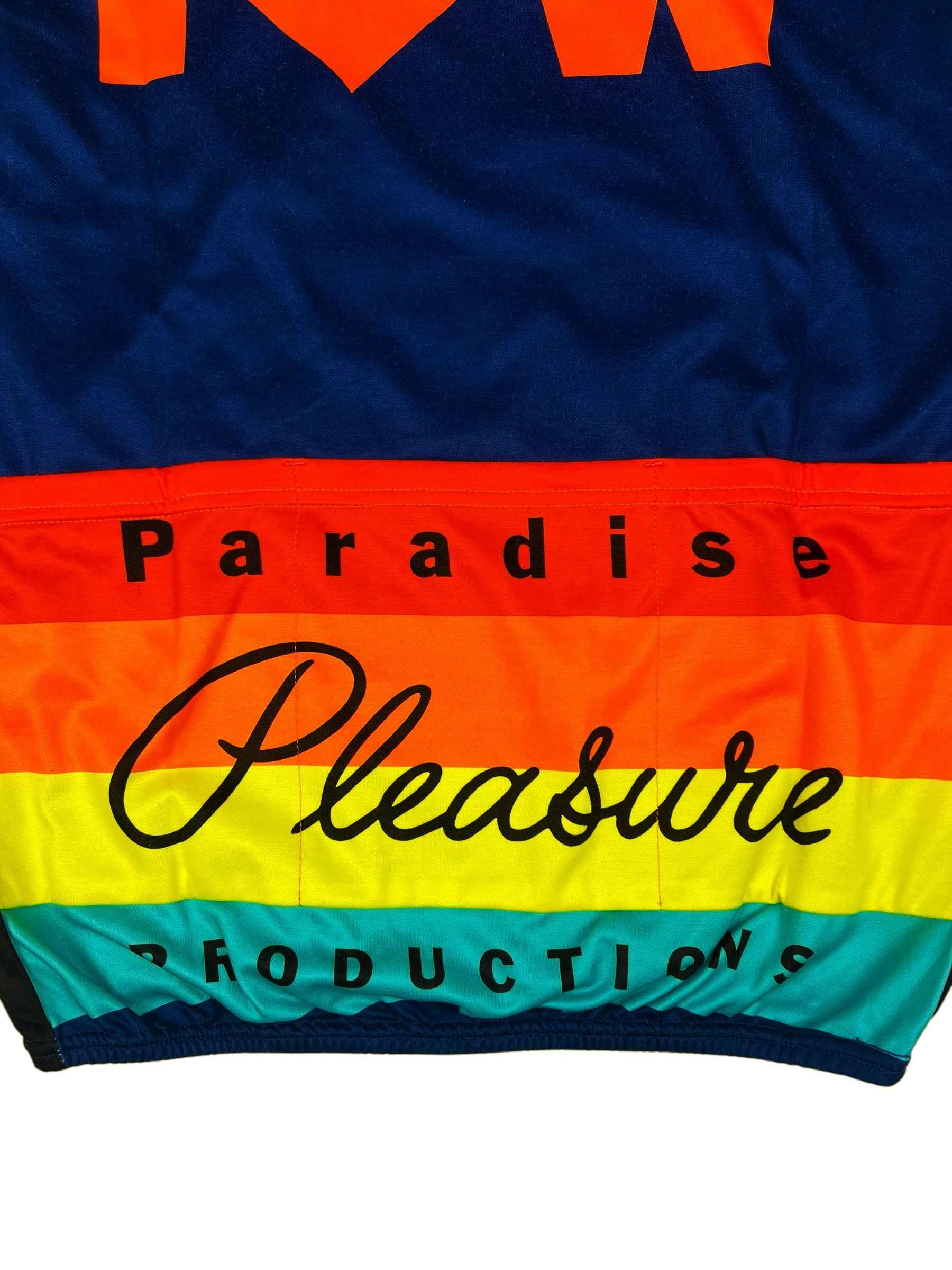This rare dark blue cycling shirt originates from Walter Van Beirendonck's W< subline, featured in the Spring/Summer 1996 'Paradise Pleasure Production' collection. A runway piece that exemplifies the avant-garde aesthetic of mid-90s Belgian fashion design, this garment represents a pivotal moment in contemporary menswear when sportswear silhouettes merged with high-fashion sensibilities. The cycling shirt's streamlined cut and technical fabric reflect the era's fascination with performance wear reimagined through a conceptual lens.