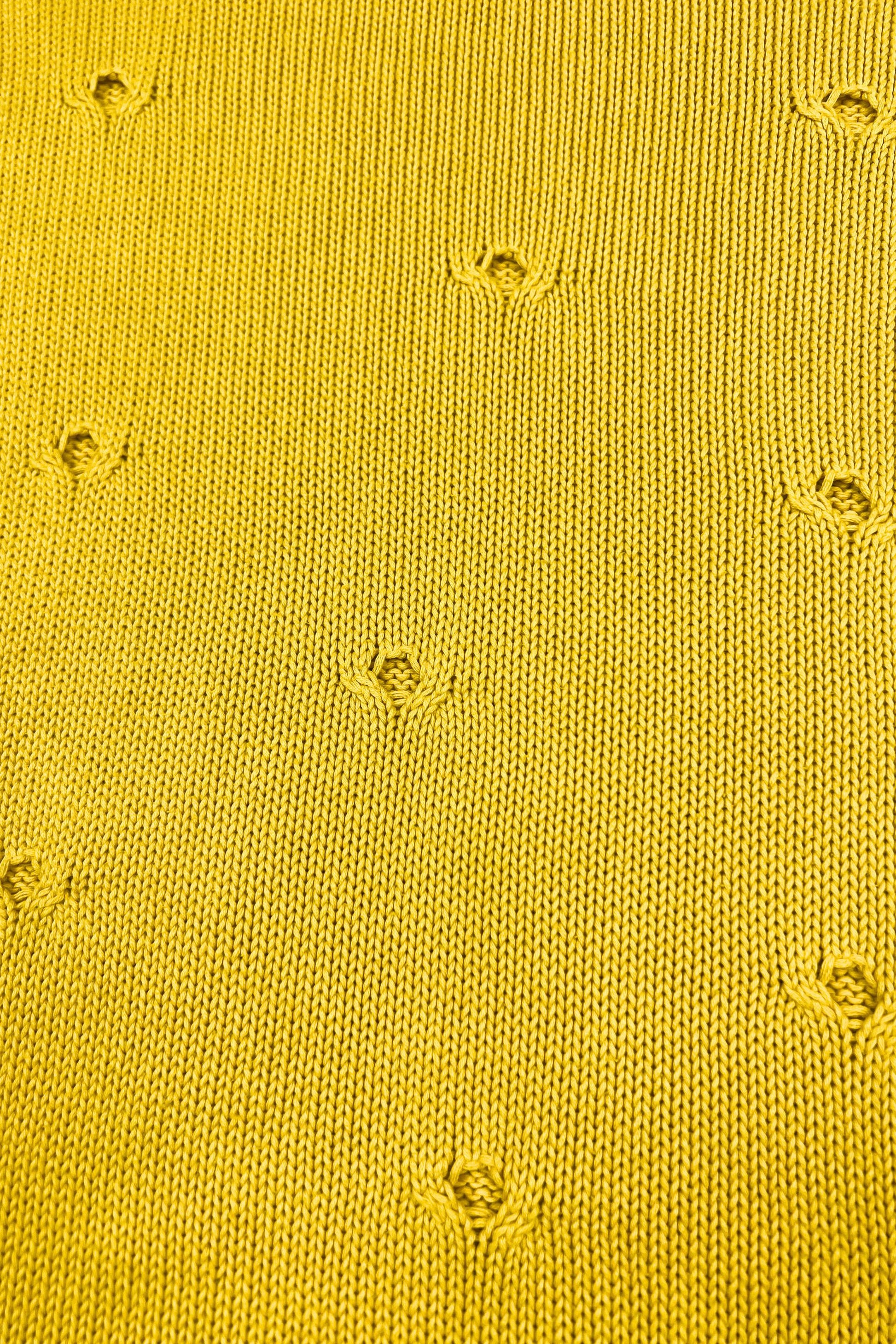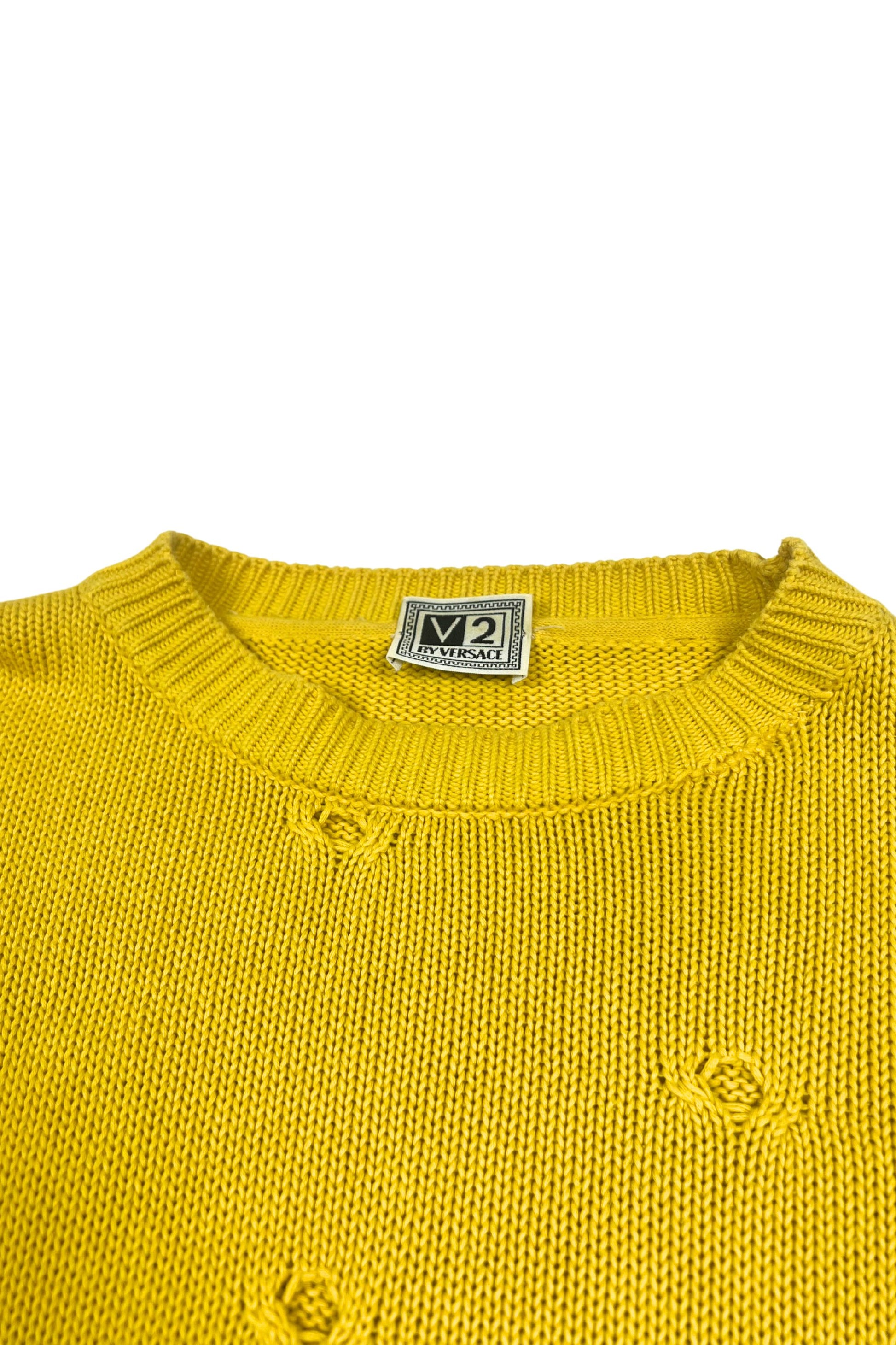 90s Versace yellow knitted sweater featuring an all-over hole design. The intentional openings create a bold, textured effect that stands out when worn.
